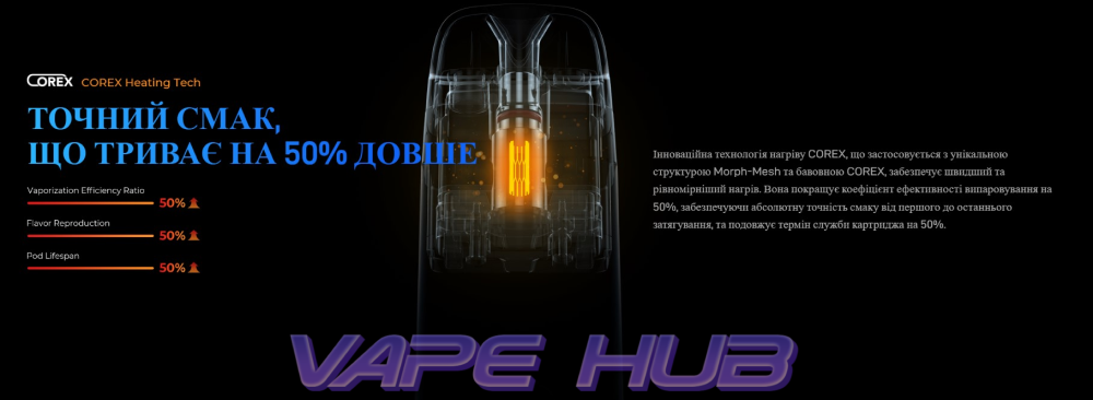 Картриджі COREX 2.0 і COREX 3.0 доступні з різними опорами 0.4, 0.6, 0.7, 0.8, 1.0, 1.2 Ohm що дозволяє підібрати картридж під будь-який стиль паріння, а самі технології COREX забезпечують кращу смакопередачу, стабільну роботу та довший ресурс.