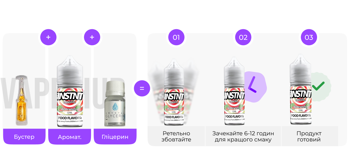 Перед використанням додай потрібну кількість нікотину. Потім добре збовтай флакон, щоб база та ароматизатори рівномірно змішалися. Після змішування залиште суміш настоюватися, після того насолоджуйтесь насиченим ароматом та м’яким ударом по горлу. Після настоювання збовтай баночку і залий рідину у свій картридж і дай трохи часу просояити ватку приблизно 10 - 15 хв.