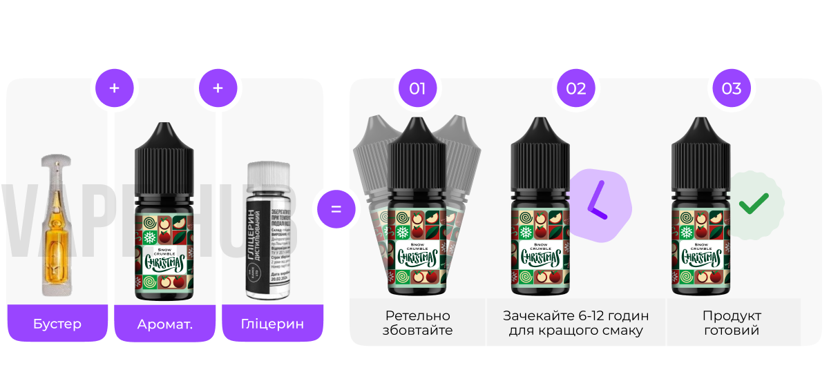 Ретельно струшуйте флакон, щоб ароматичні компоненти та сольовий нікотин рівномірно поєдналися. Використовуйте рідину для самозамісу у бажаних пропорціях і дайте суміші трохи постояти, щоб смак повністю розкрився. Насолоджуйтесь насиченим ароматом та м’яким, але відчутним ударом по горлу. Перед заправкою нового картриджа ще раз струшуйте флакон і зачекайте приблизно 15 хвилин.