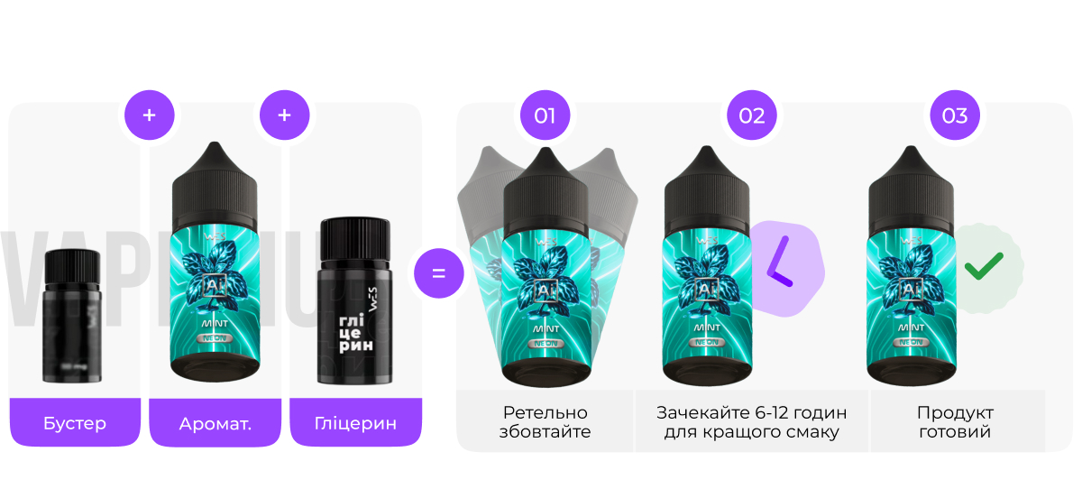 WES AI Neon 30 мл - це набір для самостійного змішування. Швидко, зручно та вигідно: достатньо змішати компоненти, і твоя рідина готова.