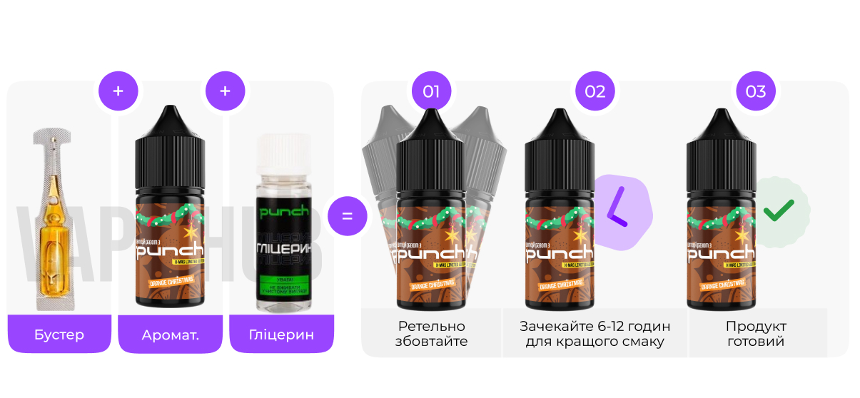 Копоненты Punch Christmas Edition производятся на европейском оборудовании с соблюдением строгих стандартов чистоты и стабильности. В производстве используются ароматизаторы премиум-класса, обеспечивающие яркое и стойкое раскрытие вкуса. Это набор, которому можно доверять.